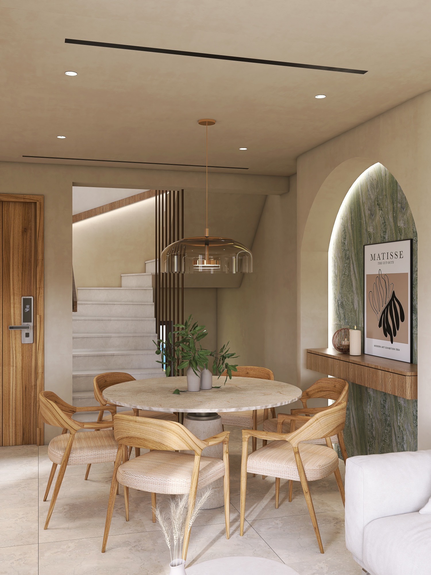 The interior aesthetic is defined by natural materials, neutral tones, and soft textures, creating an atmosphere of calm and refined elegance. Large openings invite natural light and the landscape into the home, while every detail — from marble staircases to custom-crafted woodwork — reflects an unwavering dedication to quality.