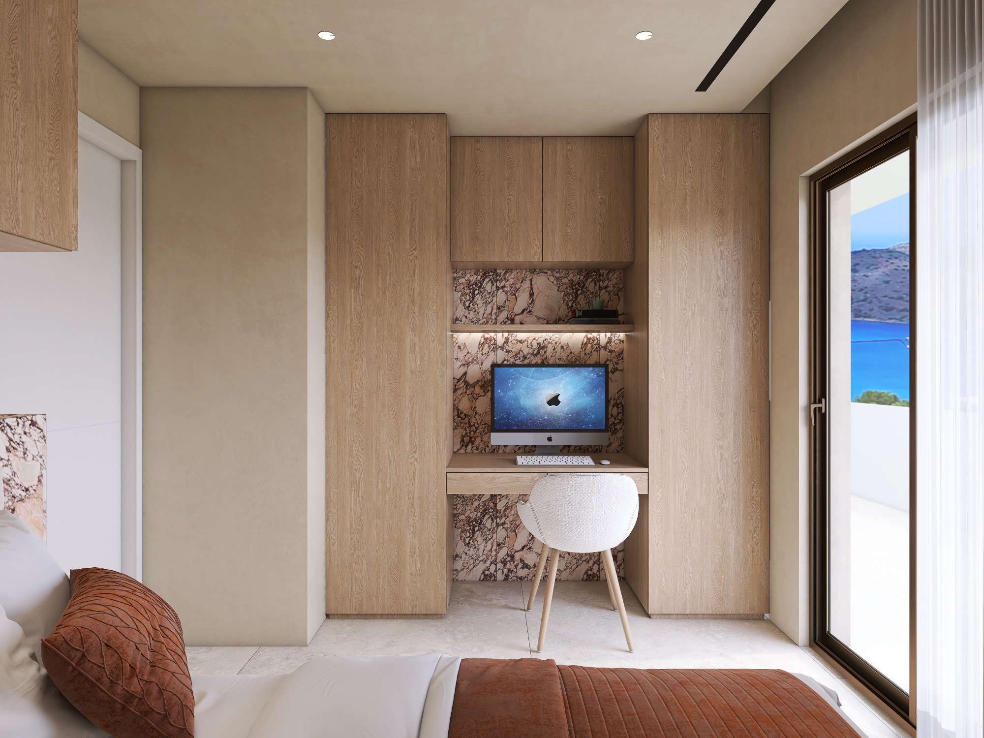 Outdoors, the private pool and landscaped gardens form a serene oasis, ideal for moments of relaxation under the Cretan sun.